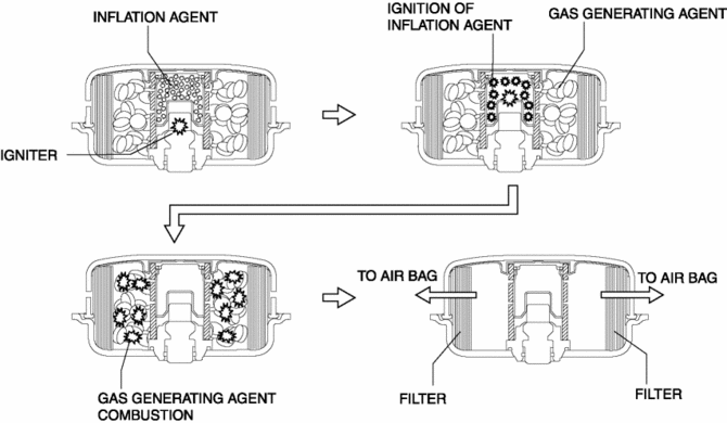 2. The ignition of the ignition agent causes the combustion of a gas generating agent which forms nitrogen gas.