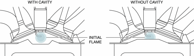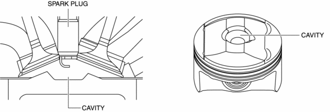 The piston has a cavity on the top surface. As a result, the initial combustion flame is prevented from hitting the top surface of the piston to reduce cooling loss.