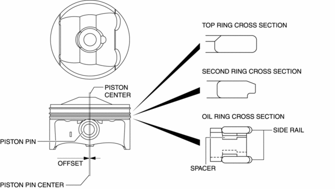 The piston ring consists of the compression ring (top ring, second ring) and the oil ring, and has the following function.