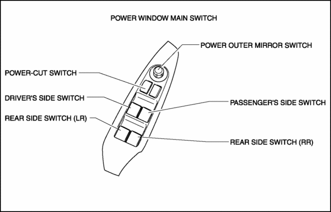 When the power-cut switch is pressed, it disables the operation of the power window subswitches for the front and rear passenger seats.