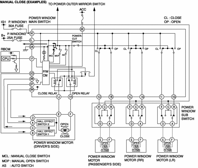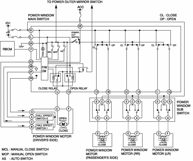 When the power window main switch is operated for auto open/close operation, it sends an auto open/close signal to the P/W CM.
