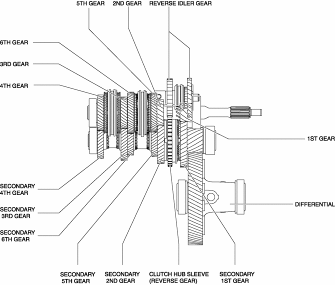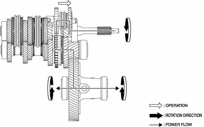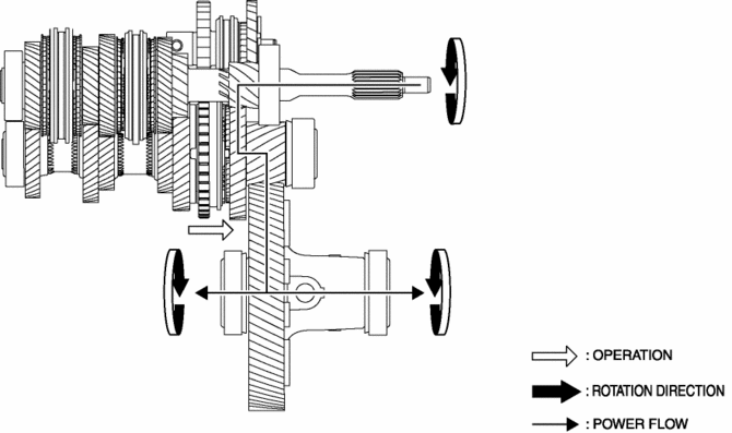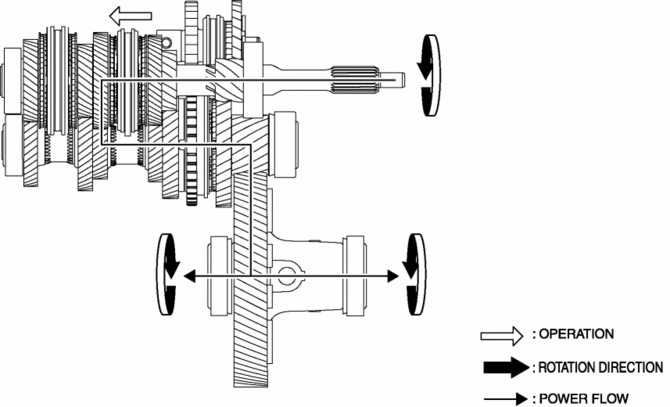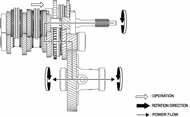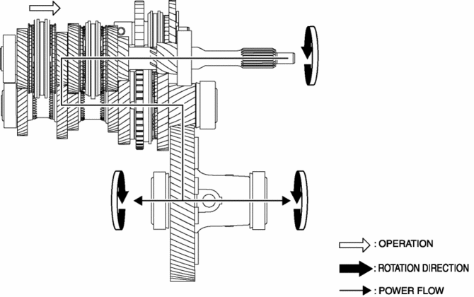 The powertrain mechanism changes the gear combination by engaging or releasing the clutch hub and gear, and changes the power transmission route. Because of the change in the power transmission route, the drive force (speed, torque, rotation direction) input from the engine is converted.