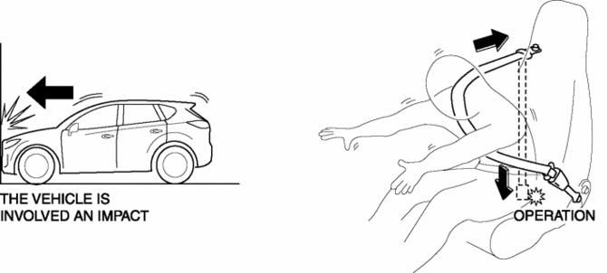 The pre-tensioner seat belts operate (deploy) based on the operation signal from the SAS control module to instantly retract and tighten the belt webbing, restraining the driver and front passenger.