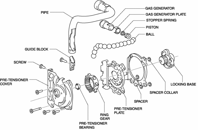 The pre-tensioner seat belt consists of the following parts shown in the figure: