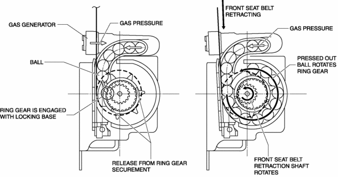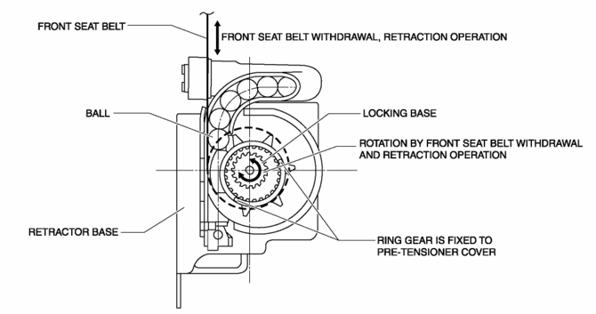 The ring gear rotates in conjunction with the withdrawal and retraction of the front seat belts, however, in the pre-tensioner part it is kept separated.