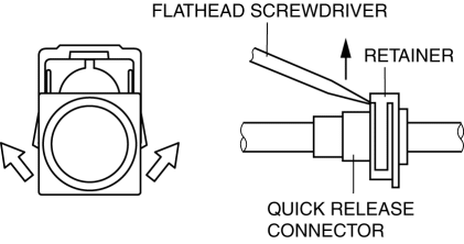The quick release connector can be removed by pushing the center of the retainer tabs.