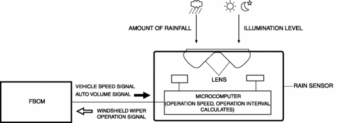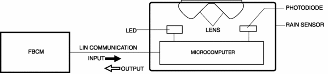 The rain sensor consists of the lens, LED, photodiode, and microcomputer, and sends/receives signals between the front body control module (FBCM) using LIN communication.