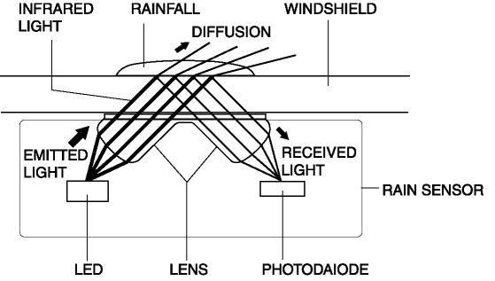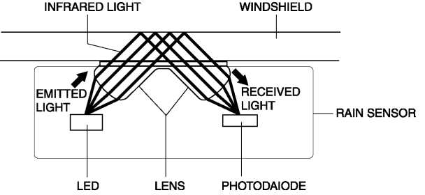The rain sensor emits infrared light from the internal LED, and the infrared light is reflected off the windshield via the lens and received by the photodiode in the rain sensor.