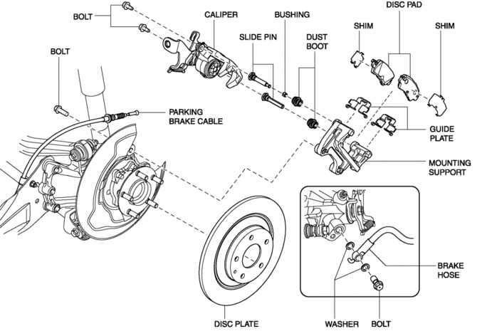 When brake fluid is applied, the piston equipped on one side of the caliper is pushed out and the brake pad is pushed against the disc plate. At the same time, the caliper body moves in the direction opposite of the direction in which the piston is pushed out so as to push the brake pad on the other side and generate brake force.