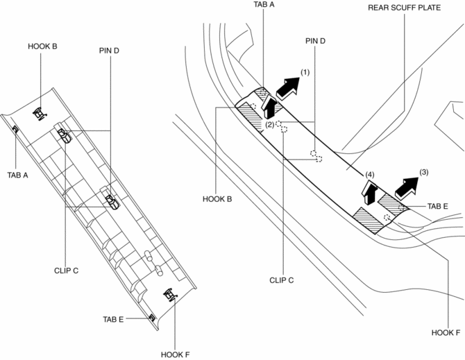 1. Take the shaded area shown in the figure, detach tab A while pulling the rear scuff plate in the direction of the arrow (1) shown in the figure, then detach hook B, clips C, pins D while pulling in the direction of the arrow (2).
