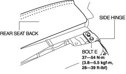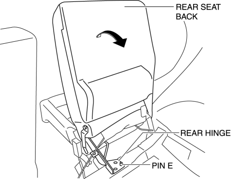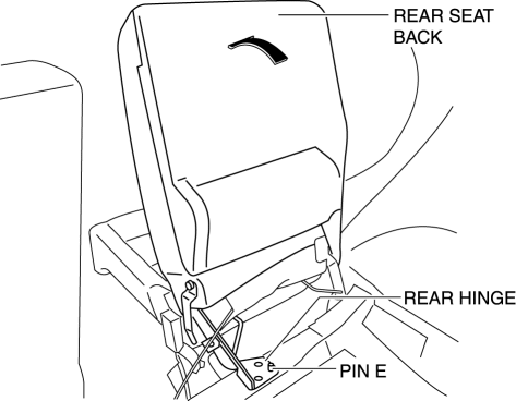 1. While moving the rear seat back in the direction of arrow shown in the figure, remove the rear hinge to pin E.