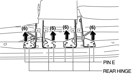 12. Move the rear hinge in the direction of the arrow (6) shown in the figure and disconnect pins E..