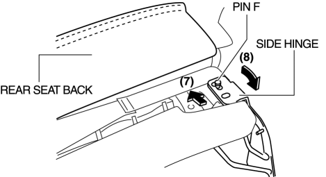 14. After moving the rear seat in the direction of the arrow (7) shown in the figure, remove pin F while moving the side hinge in the direction of the arrow (8).