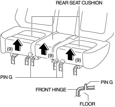 15. Lift up the rear seat cushion in the direction of the arrow (9) shown in the figure and set pins G aside from the front hinge.