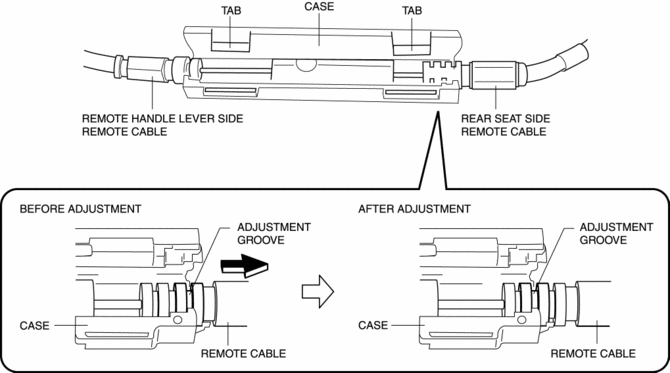 If the remote cable adjustment groove is moved excessively, the remote cable is pulled in the unlock direction and the rear seat back may not be able to lock. When adjusting the remote cable, move the position of the adjustment groove one step at a time while verifying the lock condition of the rear seat back.