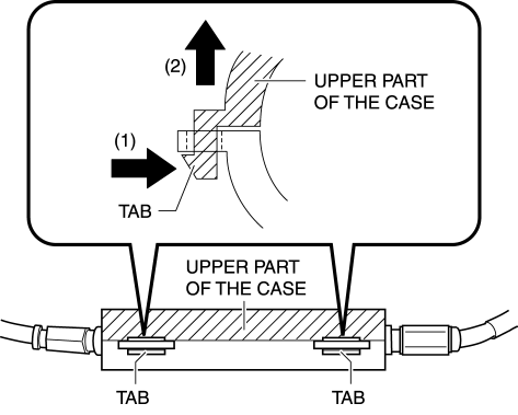 3. Press the tab in the direction of the arrow (1) shown in the figure to disengage it, and open the upper part of the case in the direction of the arrow (2).