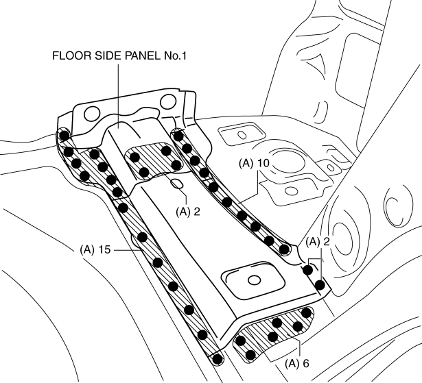 1. Drill the 35 locations indicated by (A) shown in the figure, then remove the floor side panel No.1.
