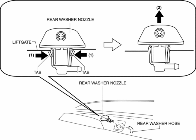 5. While pressing tabs of the rear washer nozzle in the direction of the arrows (1) shown in the figure, pull the rear washer nozzle in the direction of the arrow (2) to remove it from the liftgate.