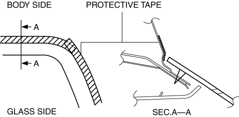 Before removing the rear window glass from the body, mark the position of the glass by affixing tape to the glass and body panel.