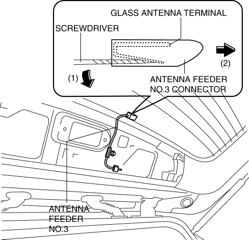 3. Using a screwdriver wrapped in protective tape, pull the antenna feeder No.3 connector in the direction of the arrow (2) shown in the figure while pressing glass antenna terminal in the direction of the arrow (1) shown in the figure, and disengage the glass antenna terminal from the antenna feeder No.3 connector. (with SIRIUS satellite radio system)