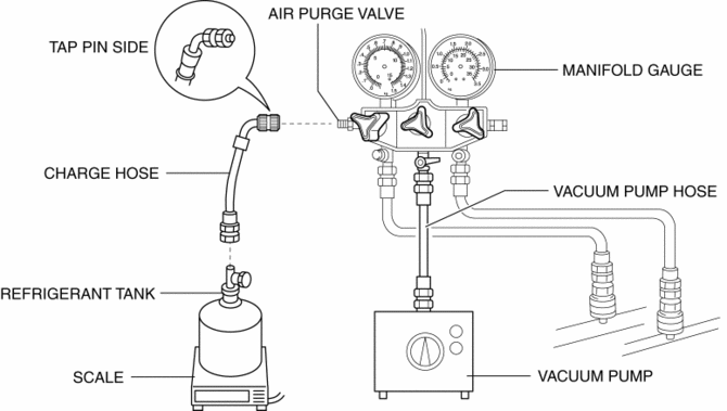 2. Connect the tap pin side of the charging hose to the air purge valve of the manifold gauge.