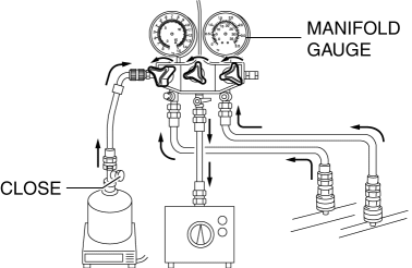 11. Close the low-pressure side valve of the manifold gauge and the valve of the refrigerant tank.