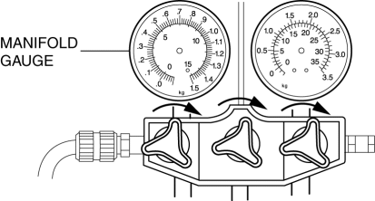 4. When the high-pressure side reading increases to 0.098 MPa {1.0 kgf/cm2, 14 psi}