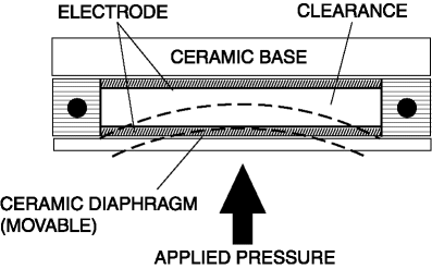 There is a clearance between the movable ceramic diaphragm and the ceramic base, and each side has an electrode.