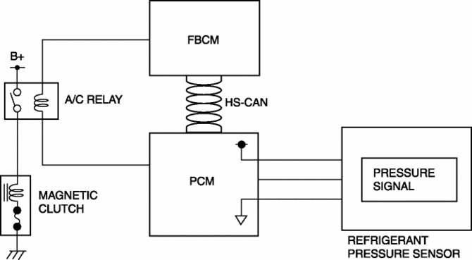 The refrigerant pressure sensor converts the detected refrigerant pressure to an electric signal and sends it to the PCM.