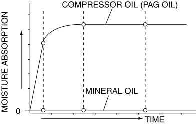 Compressor oil (PAG oil) has a higher moisture absorption efficiency than the previously used mineral oil. If moisture mixes with the compressor oil, the refrigerant system could be damaged. Therefore, install caps immediately after using the compressor oil or removing refrigerant system parts to prevent moisture absorption.