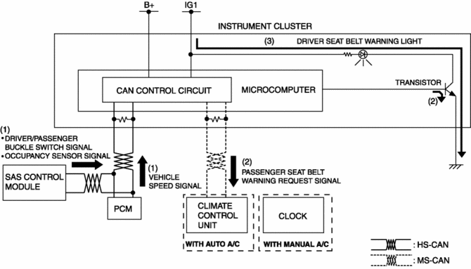 2. The instrument cluster microcomputer turns the transistor on (2) intermittently for flashing and continuously for illumination based on the each signal. In addition, it sends a driver/passenger seat belt warning request signal to the clock (with manual A/C)/climate control unit (with auto A/C).