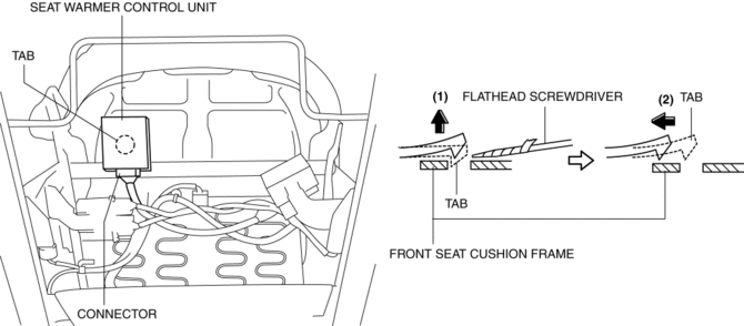 4. Using a flathead screwdriver, disconnect the seat warmer control unit in the direction of the arrow (2) while releasing tab in the direction of the arrow (1) shown in the figure.