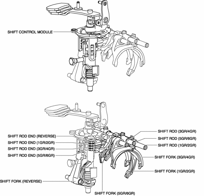 The shift and select mechanism moves the shift fork to change gears according to the operation of the shift lever in the cabin.