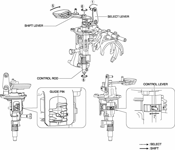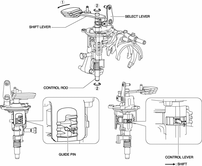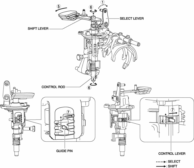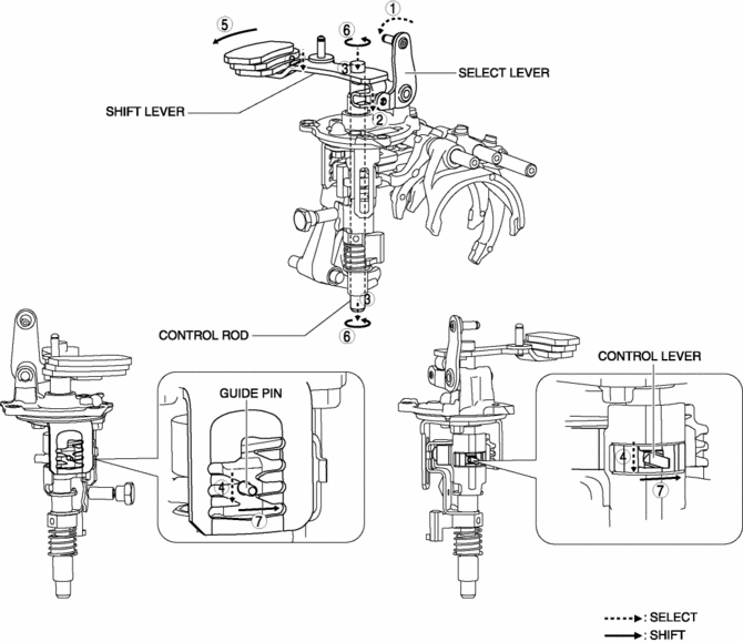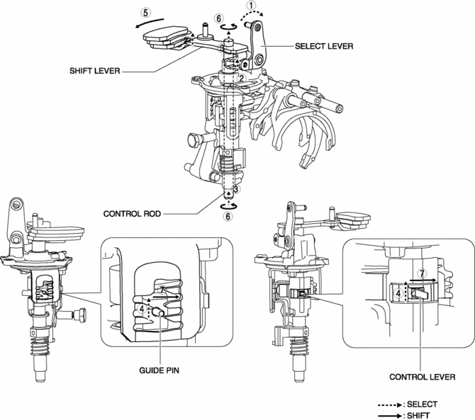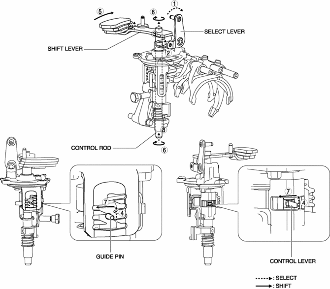1. When the shift lever in the cabin is tilted to the right to shift to 6GR, the select lever moves in the direction of arrow 1 shown in the figure.