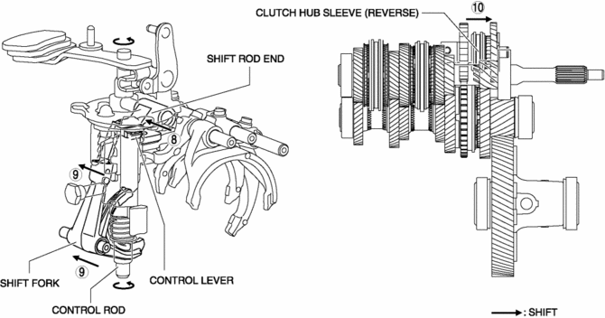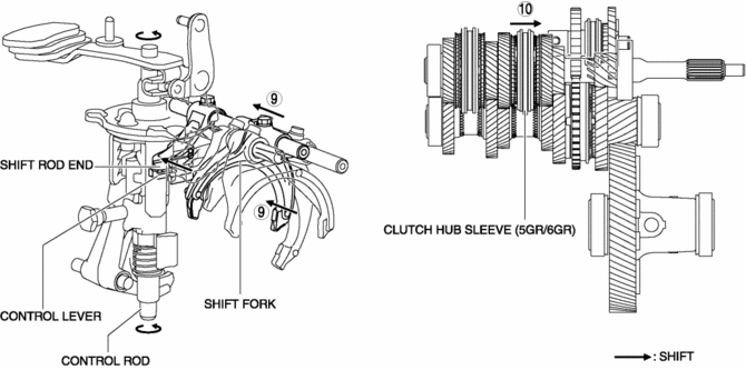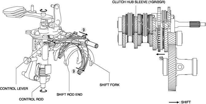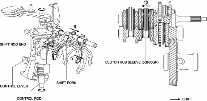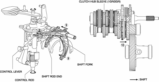 9. The shift rod end and the shift fork are integrated with the shift rod. Therefore, the movement of the shift rod end is transmitted to the shift fork via the shift rod, and the shift fork moves in the direction of arrow 9.