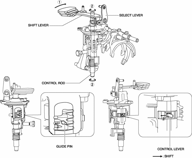 3. Following the movement of the shift lever in the engine compartment, the control lever and the guide pin move in the direction of arrow 3 shown in the figure.