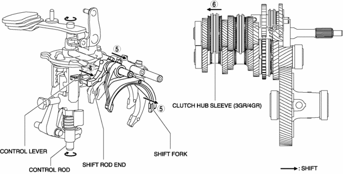 5. The shift rod end and the shift fork are integrated with the shift rod. Therefore, the movement of the shift rod end is transmitted to the shift fork via the shift rod, and the shift fork moves in the direction of arrow 5.