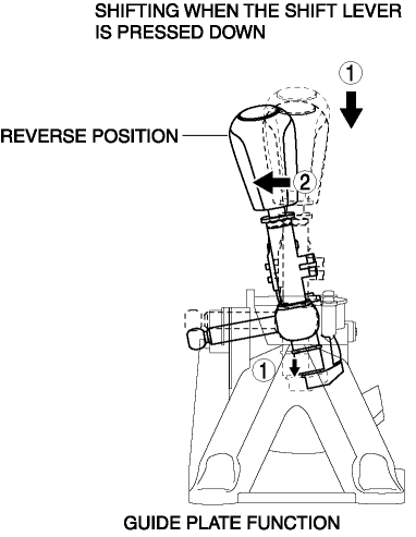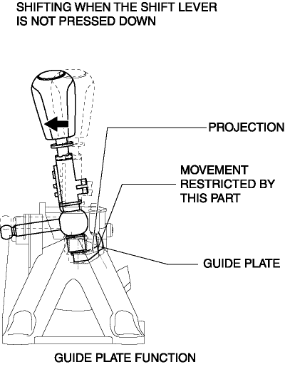 When shifting into reverse, once the shift lever is pressed down and moved towards the reverse position, the projection on the lever goes under the guide plate, releasing the reverse shift restriction and allowing for shifting into reverse.