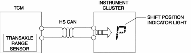 The TCM sends a shift position indicator light illumination request signal to the instrument cluster via CAN based on the signal from the integrated transaxle range sensor signal received via CAN.