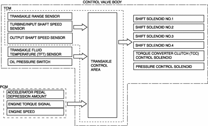 The TCM drives shift solenoids No.1, 2, 3, 4, the pressure control solenoid, and the on/off solenoid based on inputs signals from each switch and sensor, and performs direct electronic control of the clutch engagement pressure. As a result, precise hydraulic pressure control of the clutch engagement, not possible using a conventional accumulator, is achieved.