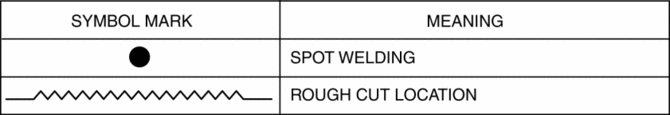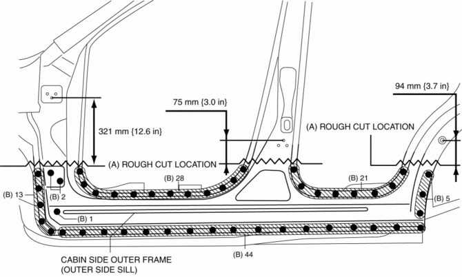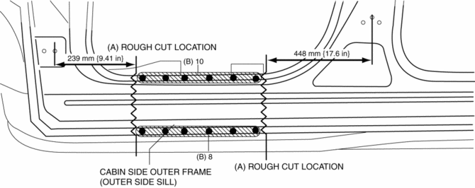 2. Drill the 114 locations indicated by (B) shown in the figure, then remove the cabin side outer frame (outer side sill).