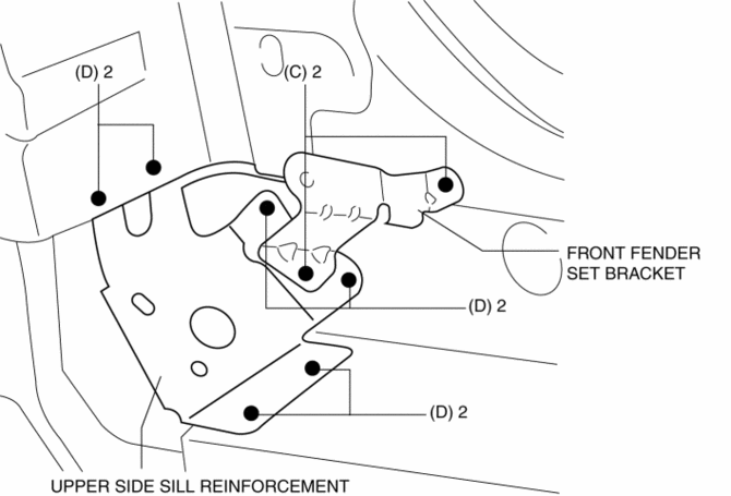 4. Drill the 6 locations indicated by (D) shown in the figure, then remove the upper side sill reinforcement.