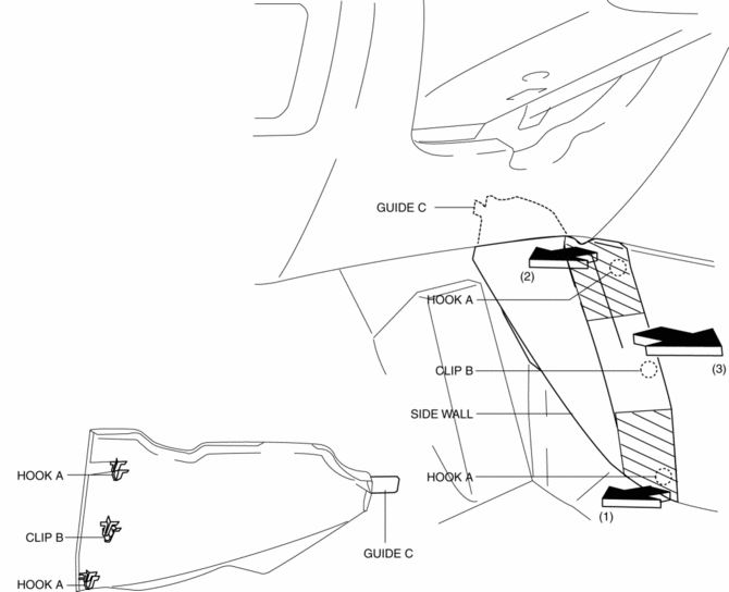 If the hooks A and clip B is removed forcefully, guide C may be damaged. Carefully remove hooks A and clip B so as not to damage guide C.