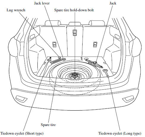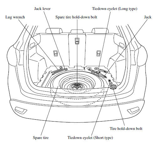 Spare tire and tools are stored in the locations illustrated in the diagram.