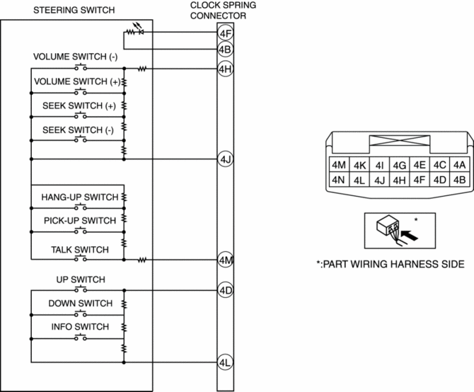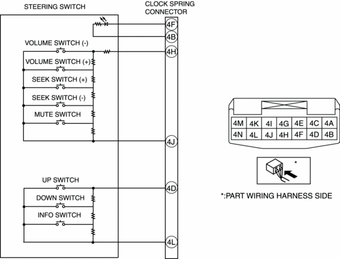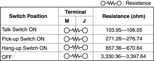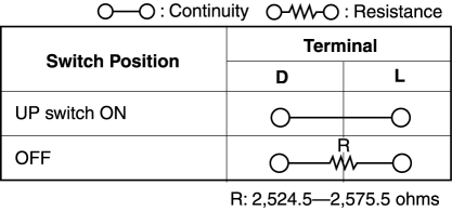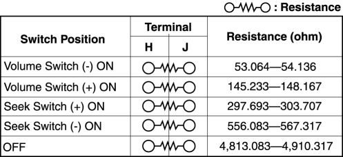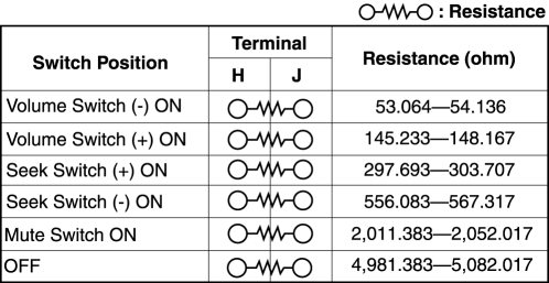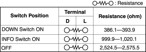 5. Verify that the resistance and continuity between the steering switch terminals is as indicated in the table.