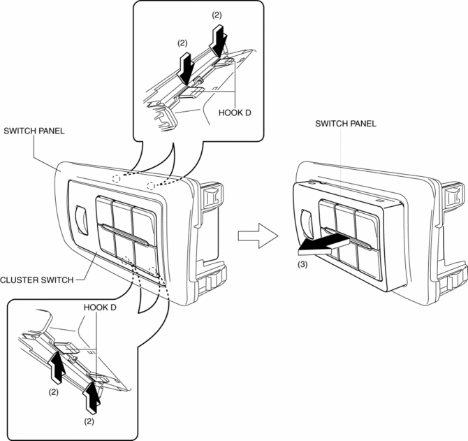 5. Remove the cluster switch in the direction of the arrow (3) while detaching hooks D in the direction of the arrow (2).