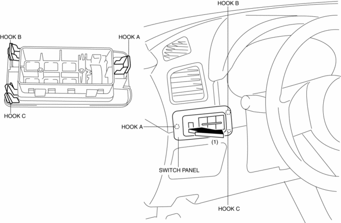 3. Insert your hand from the lower side of the lower panel (without car-navigation system) or the area where the car-navigation unit was installed (with car-navigation system), press the switch panel in the direction of the arrow (1) shown in the figure and remove it while detaching hook A and B and hook C.