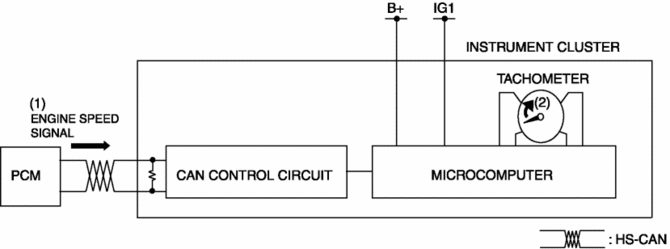 The instrument cluster receives (1) the engine speed signal from the PCM when the ignition is switched ON (engine on).