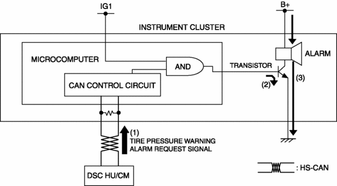 If the instrument cluster receives a tire pressure warning alarm request signal sent from the DSC HU/CM via the CAN signal, the tire pressure warning alarm is sounded.