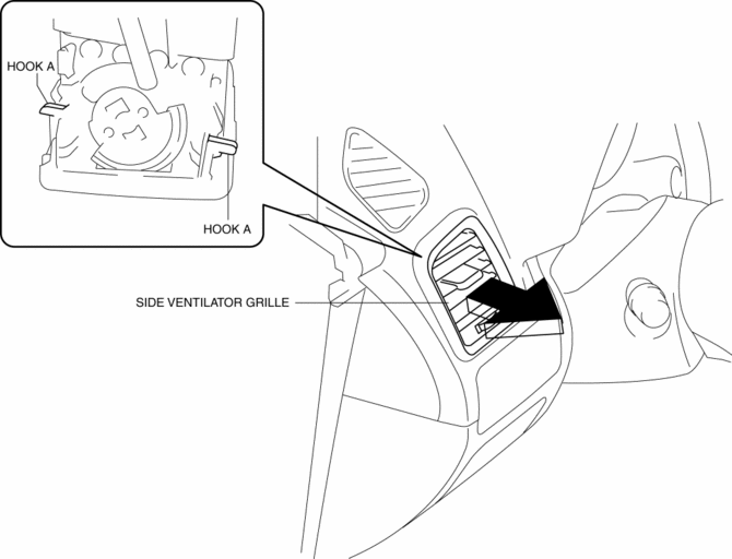 3. Insert your hand from the area where the switch panel was installed, remove the side ventilator grille in the direction of the arrow shown in the figure while detaching hooks A.